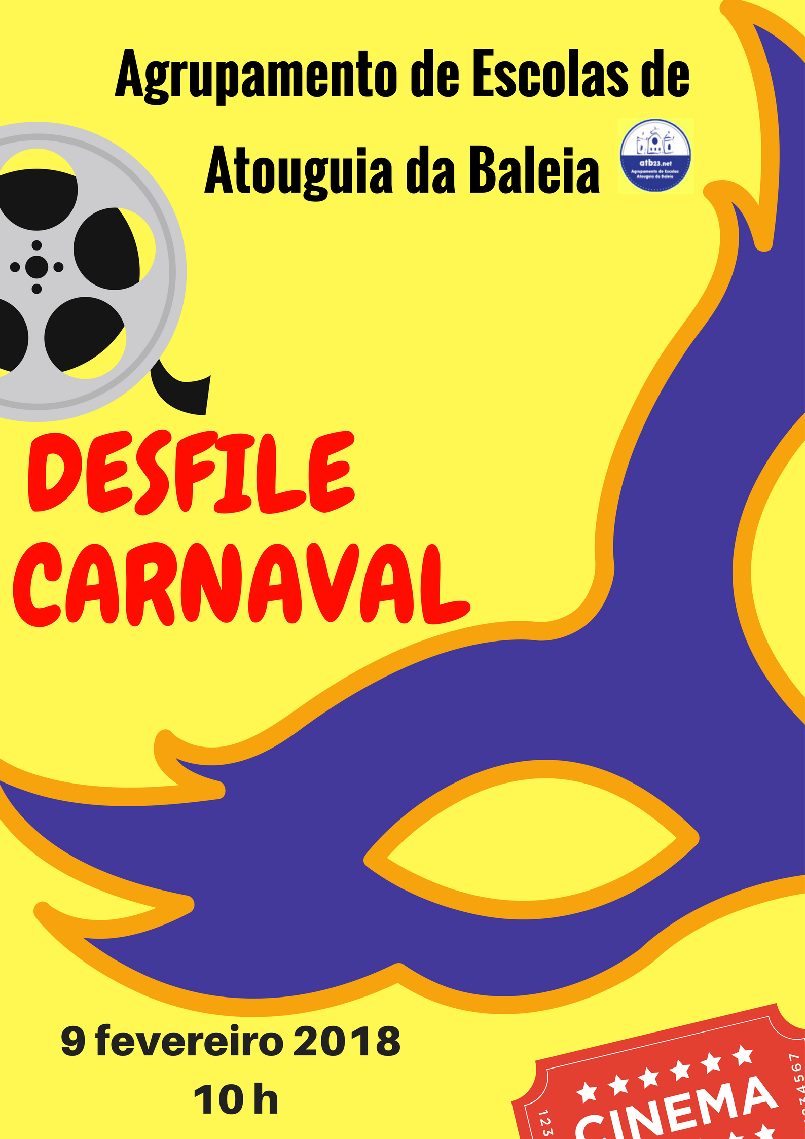 No próximo dia 9 de fevereiro, sexta-feira, tem lugar o tradicional desfile de Carnaval do nosso Agrupamento. Este ano o CINEMA vai invadir as ruas de Atouguia da Baleia. Pelas 10:00 horas, o cortejo sai da escola sede e percorre as ruas da vila, acompanhado pela música dos Arrufeiros d'Atouguia.