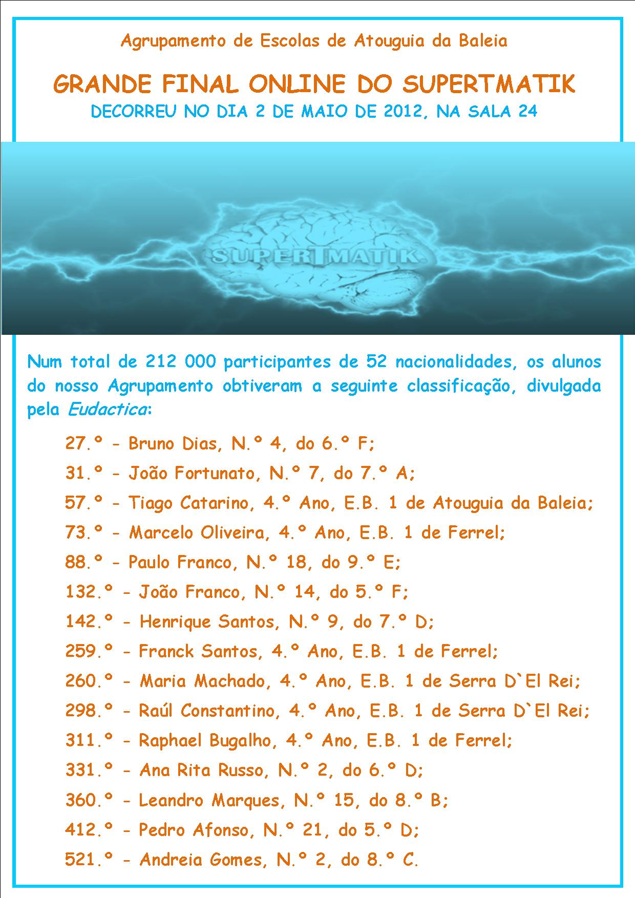 No dia 2 de Maio de 2012, decorreu, na sala 24 da escola sede do nosso agrupamento, a Grande Final Online do SuperTmatik.