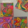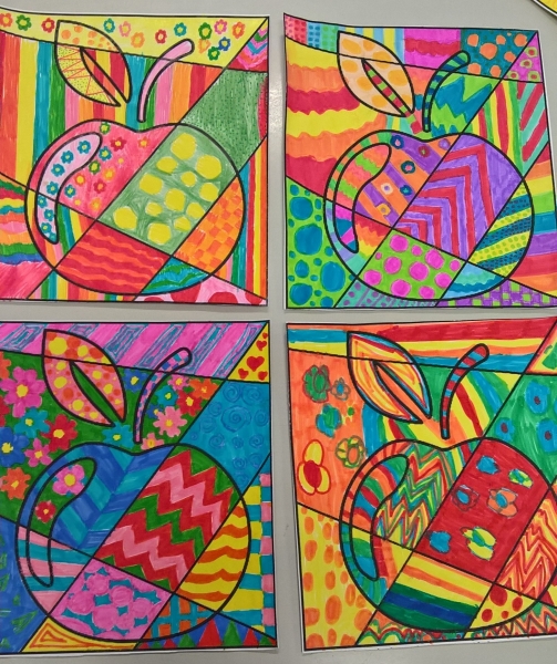 Após algum trabalho de pesquisa e observação das obras do artista, cada aluno criou a sua própria maçã ao estilo Romero Britto.