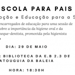 No âmbito do PES – Promoção e Educação para a Saúde e da Escola para Pais, no próximo dia 29 de maio, pelas 18:30h, na Biblioteca Escolar da escola-sede, decorre uma sessão de sensibilização sobre a importância da higiene oral e da utilização do cheque-dentista, aberta a toda a comunidade educativa e promovida pela higienista Helena Dâmaso.